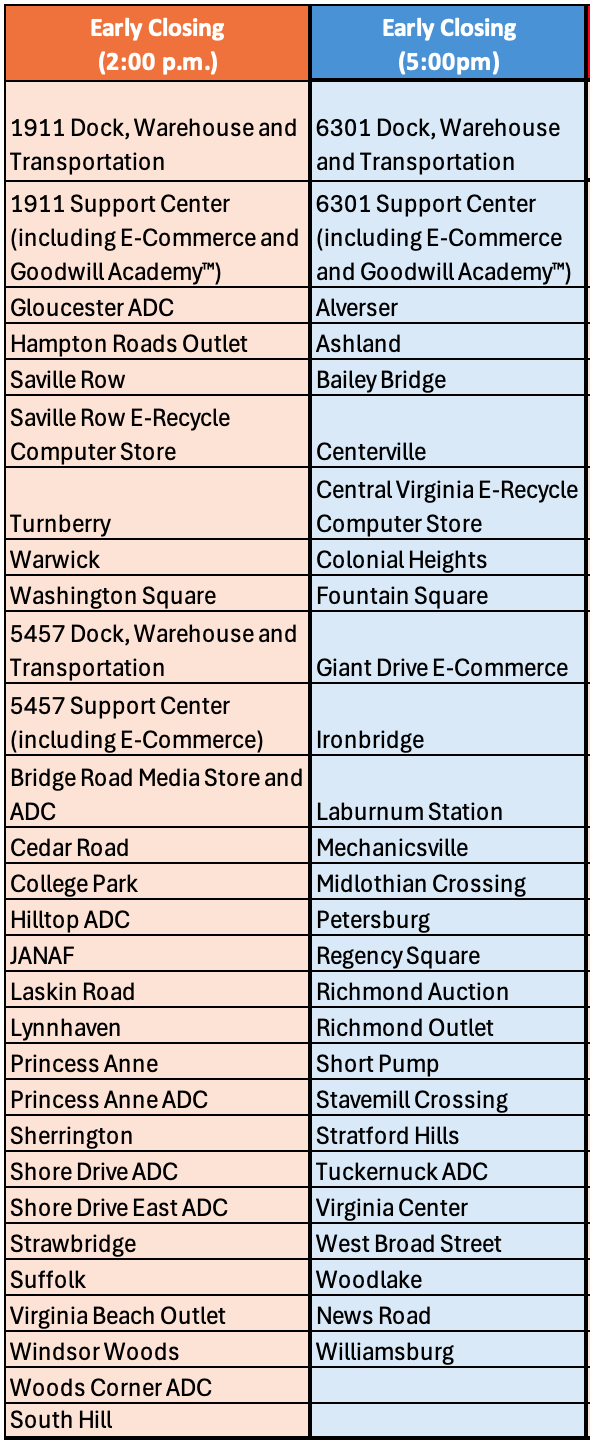 30 de enero de 2026Debido a otra tormenta invernal en nuestra región, las operaciones de Goodwill serán Cierre temprano mañana (sábado 31 de enero) y cerrado completamente en Domingo 1 de febrero. Por favor ver la tabla a continuación para obtener una lista de los horarios en que nuestras sucursales permanecerán cerradas.